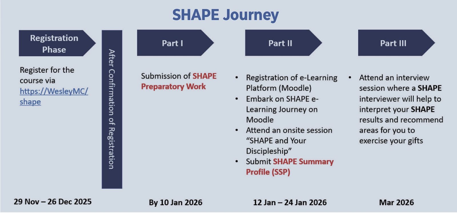If you are looking to serve in Wesley Methodist Church but don’t know where to start or what you can do, sign up for SHAPE, a combination of e-Workshop and on-site Workshop to discover the gifts God has given you to serve Him and to grow as an intentional disciple of Christ.